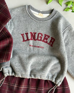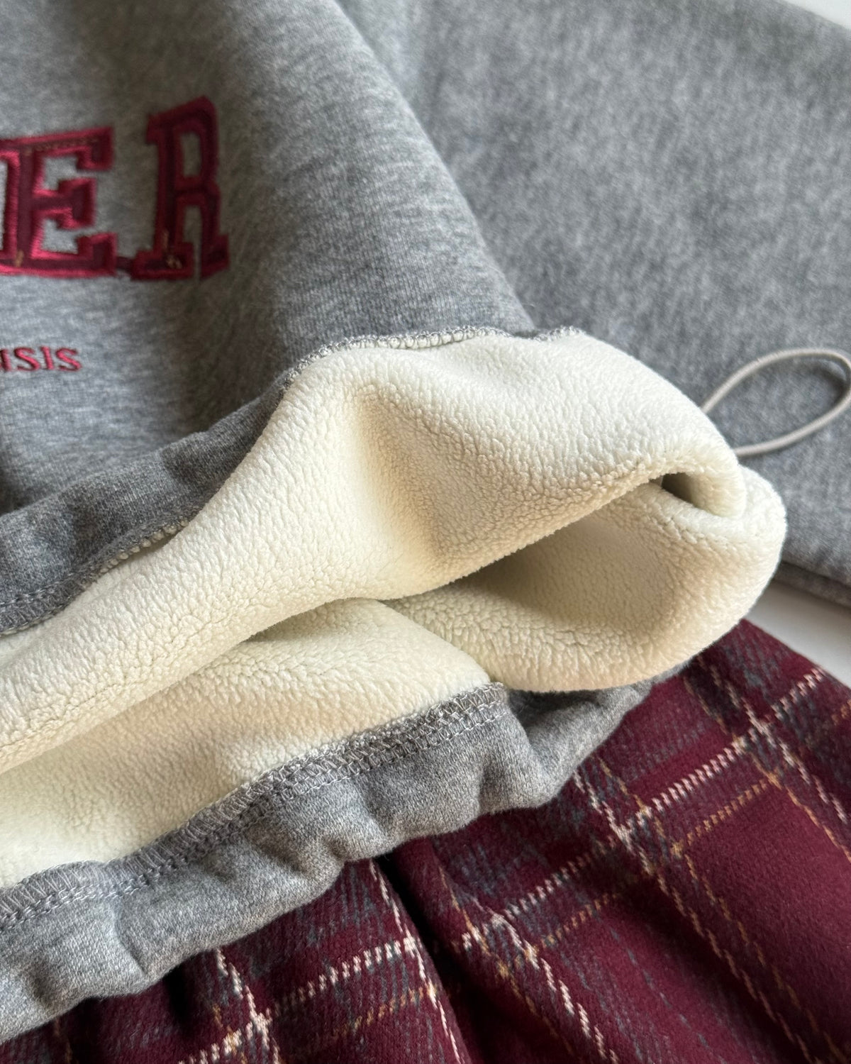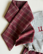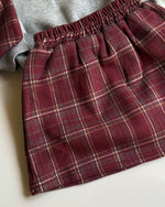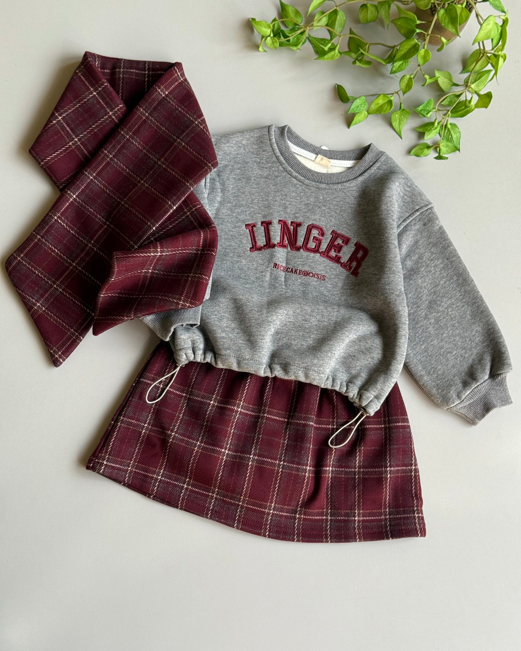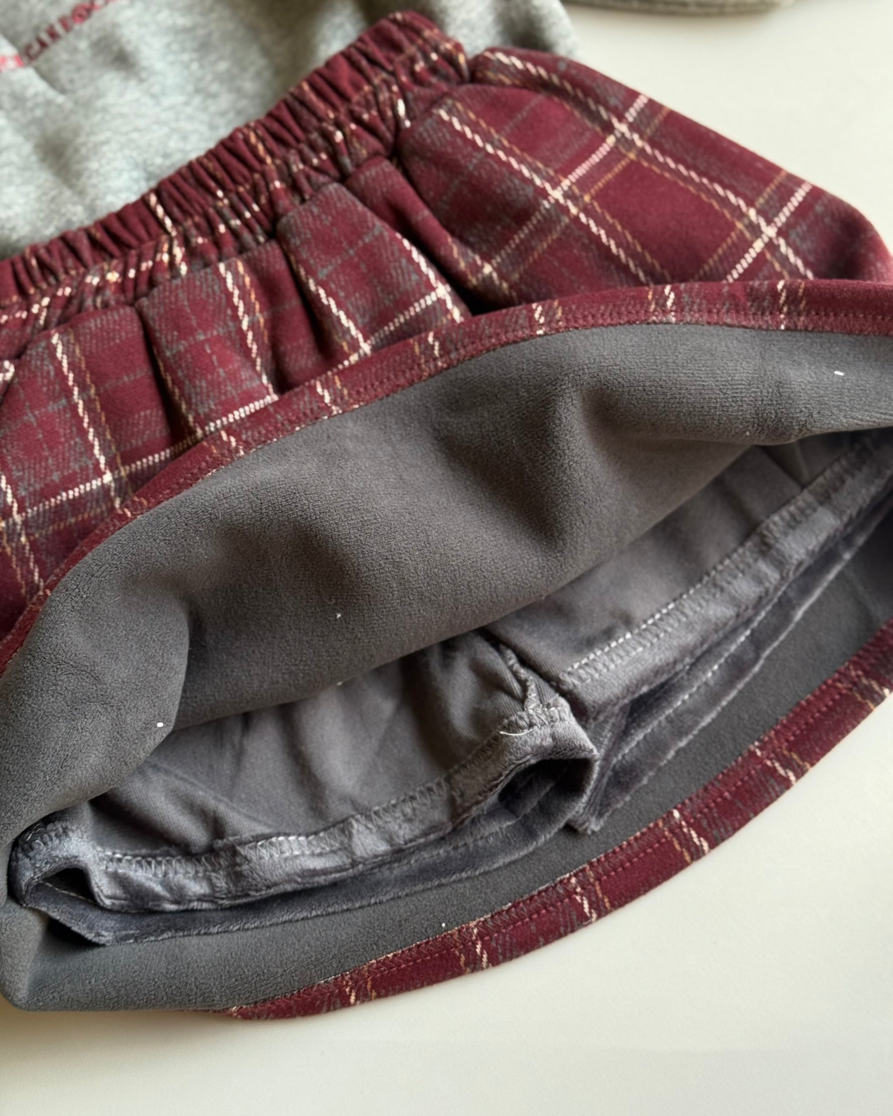 plaid sweatshirt with fleece lined burgundy skirt+ scarf
